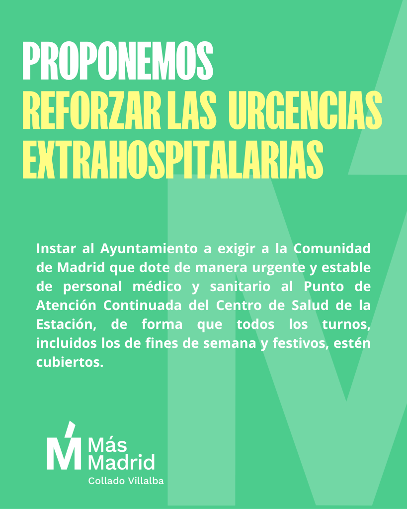 La propuesta reclama a la Comunidad de Madrid la restauración del servicio de urgencias de atención primaria en Collado Villalba en las condiciones previas a la pandemia, cuando el antiguo SUAP del centro de salud de Los Madroños funcionaba de manera ininterrumpida durante todo el año, con equipos médicos completos y una atención cercana que evitaba desplazamientos innecesarios al hospital.