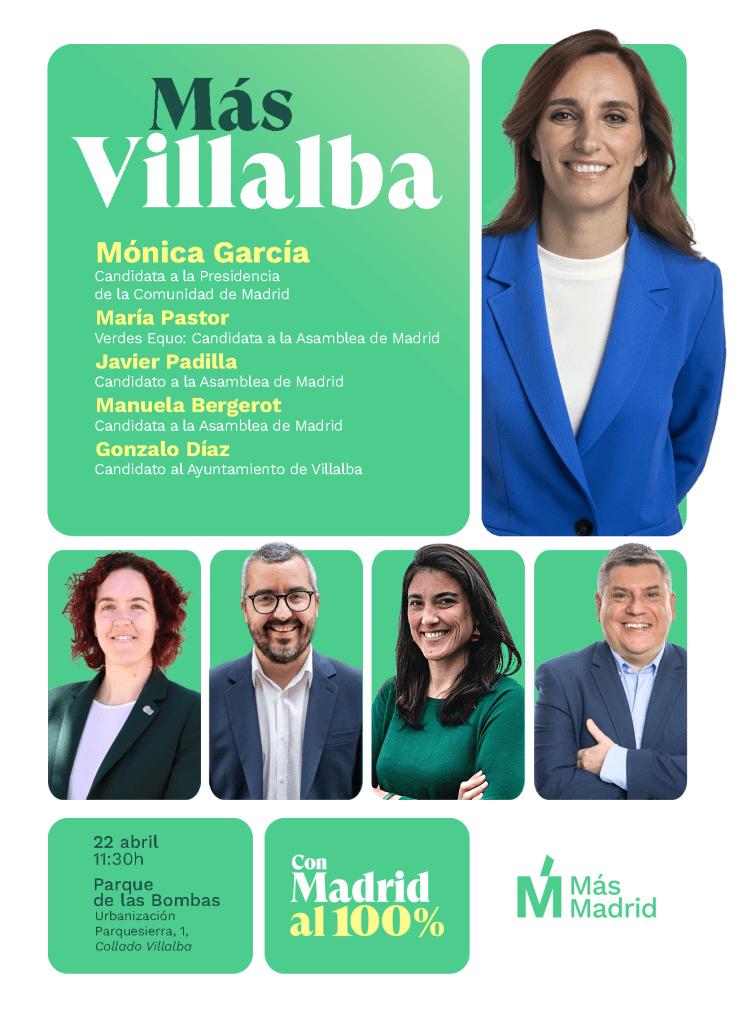 La presentación de la candidatura tendrá lugar el próximo sábado 22 en el Parque de Las Bombas a las 11:30h. En caso de lluvia, el acto se trasladaría al Auditorio del Centro Cultural de Peñalba. En el acto intervendrán Mónica García, candidata a la presidencia de la Comunidad de Madrid, y los candidatas y candidatos María Pastor, Javier Padilla, Manuela Bergerot y Gonzalo Díaz, candidato a la Alcaldía de Collado Villalba.