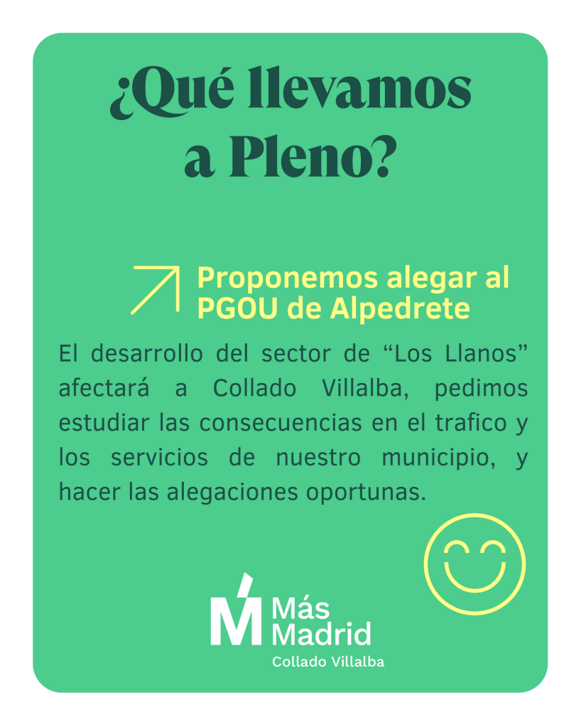 Este jueves 28 de septiembre se celebra el pleno ordinario en el ayuntamiento de #ColladoVillalba. En esta ocasión presentamos una moción donde alertamos de los efectos negativos en nuestro municipio del desarrollo urbanístico en #Alpedrete, en la zona de «Los Llanos Sur», junto a Planetocio y Los Negrales (embotellamientos en la incorporación a la A6 y M-601, calles aledañas, mayor ruido y contaminación atmosférica, etc.). Creemos que nuestro ayuntamiento debería estudiar estos efectos y hacer alegaciones.