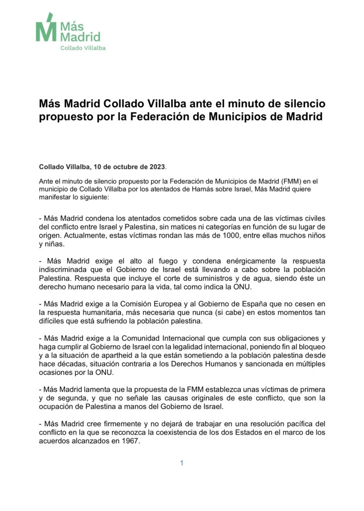 Ante el minuto de silencio propuesto por la Federación de Municipios de Madrid (FMM) en el municipio de Collado Villalba por los atentados de Hamás sobre Israel, Más Madrid quiere manifestar lo siguiente: