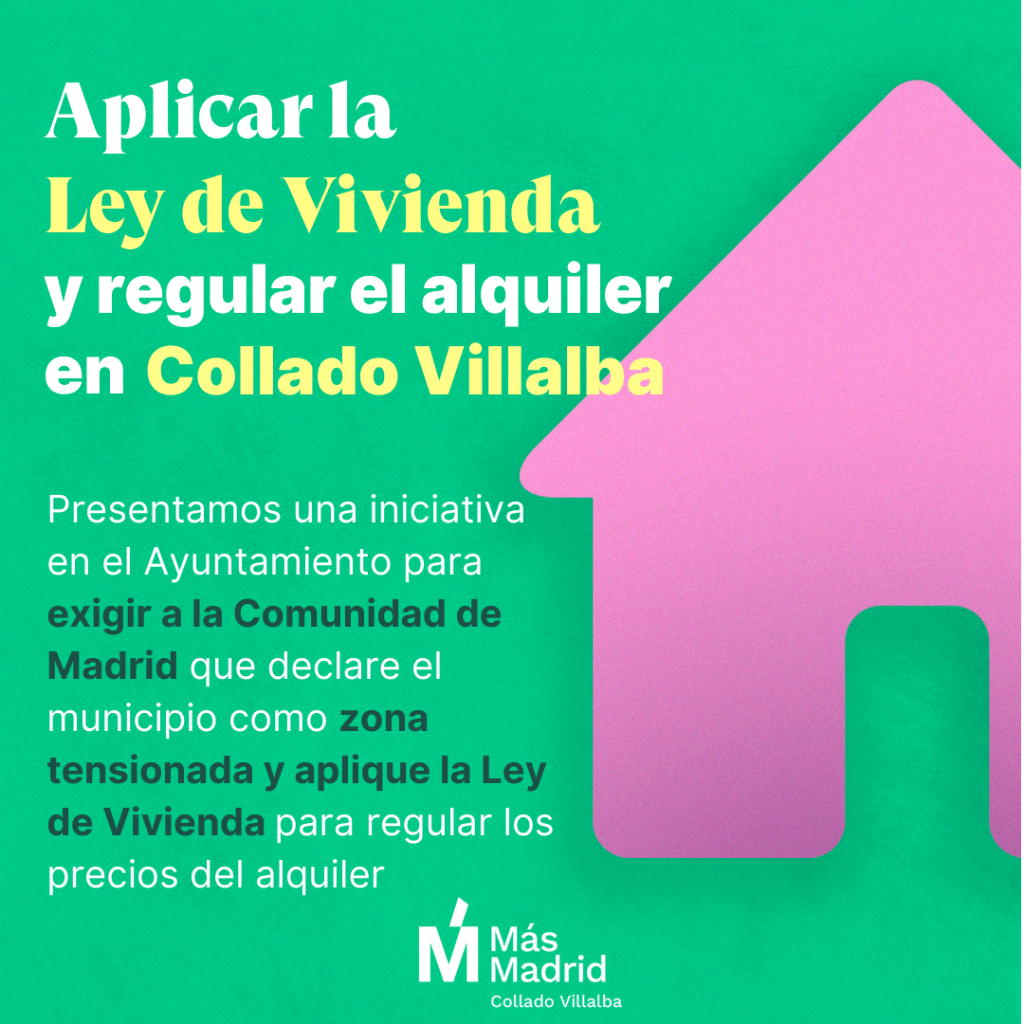 El Grupo Municipal de Más Madrid Collado Villalba ha registrado una moción para instar a la Comunidad de Madrid a que aplique la ley de vivienda estatal y permita que Collado Villalba sea declarado como zona tensionada, con el objetivo de que se apliquen las medidas recogidas en dicha ley, como la regulación del precio de los alquileres, o considerar como “gran tenedor” a los propietarios con más de cinco inmuebles, entre otras medidas. Esta moción se ha registrado de forma conjunta en el resto de los municipios donde Más Madrid tiene representación institucional. Además, el Grupo Parlamentario de Más Madrid llevó este tema a la Asamblea de Madrid la pasada semana. La moción presentada por la formación madrileña se debatirá en el pleno del próximo jueves 26 de octubre .