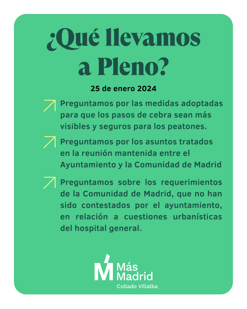 En este pleno presentamos varias preguntas para ser contestadas por el equipo de gobierno. Desde hace varios meses en Más Madrid Collado Villalba crece la preocupación ante el mal estado de los pasos de peatones en la ciudad, muchos de ellos tienen que ser repintados urgentemente y varios no tienen señalización vertical adecuada ni buena iluminación. En las ultimas semanas se han producido dos atropellos en el paso de peatones frente al centro comercial «Los Valles» uno mortal y otro con lesiones graves, es urgente que el Gobierno Municipal del PP actúe y tome medidas para que los pasos de peatones de la ciudad sean seguros.